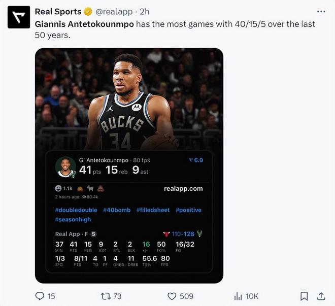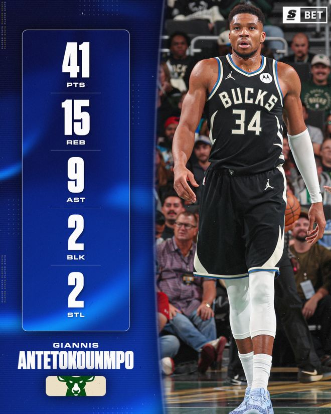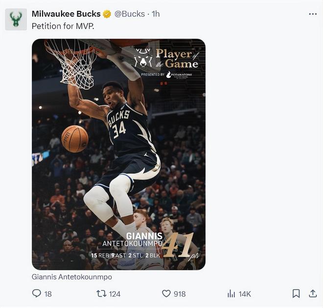 全场比赛扬尼斯37分钟,32中16,三分3中1,罚球11中8,拿到41分15篮板9助攻2抢断2盖帽,命中率50%,攻防一体,雄鹿官方:申请MVP吧。
