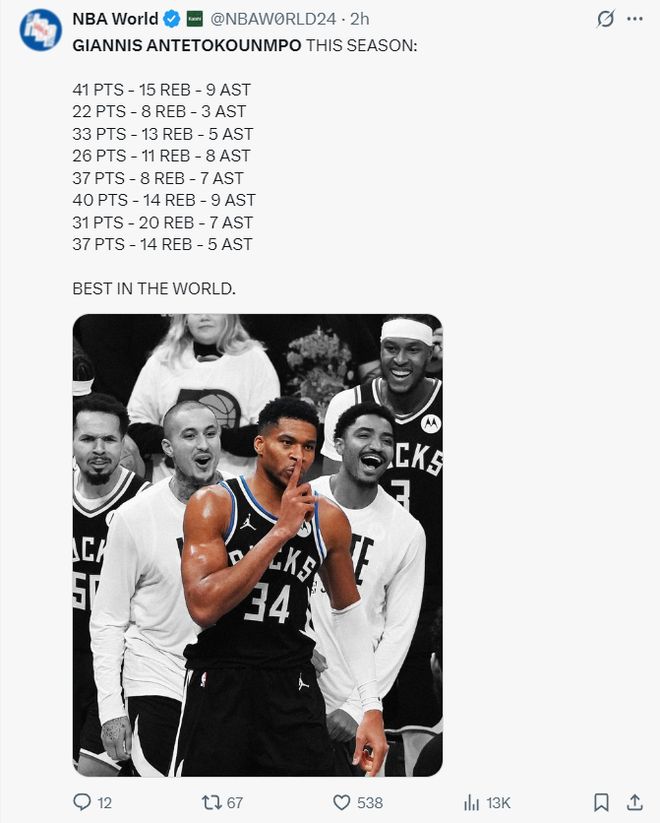 美媒NBA World晒出扬尼斯这八场比赛的数据后写道:全世界最强选手。