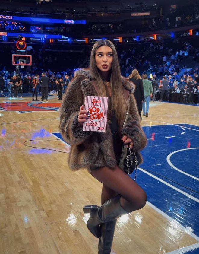 这位美女球迷是一位时尚模特,在社交媒体上拥有8万粉丝,尽管尼克斯输球,但是这明显没有影响到她的好心情。