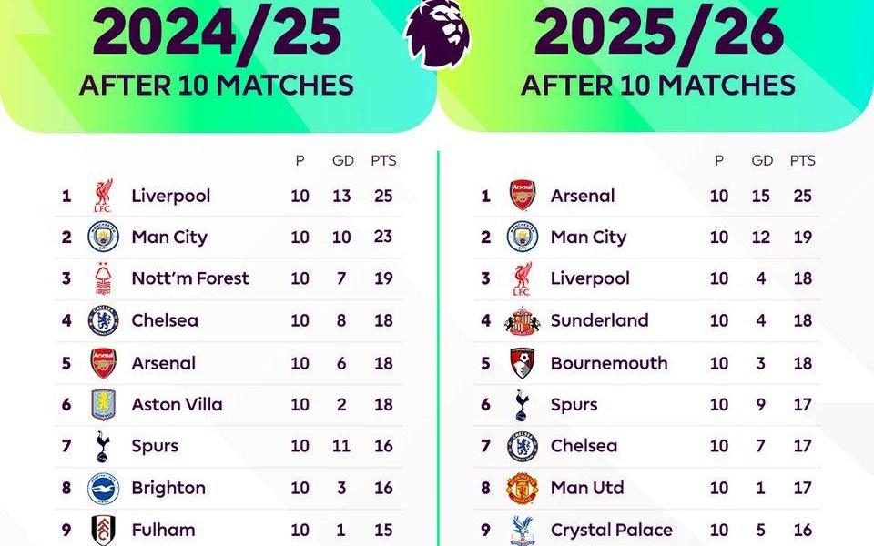 英超前10轮与上赛季同期积分对比:阿森纳、利物浦积分互换