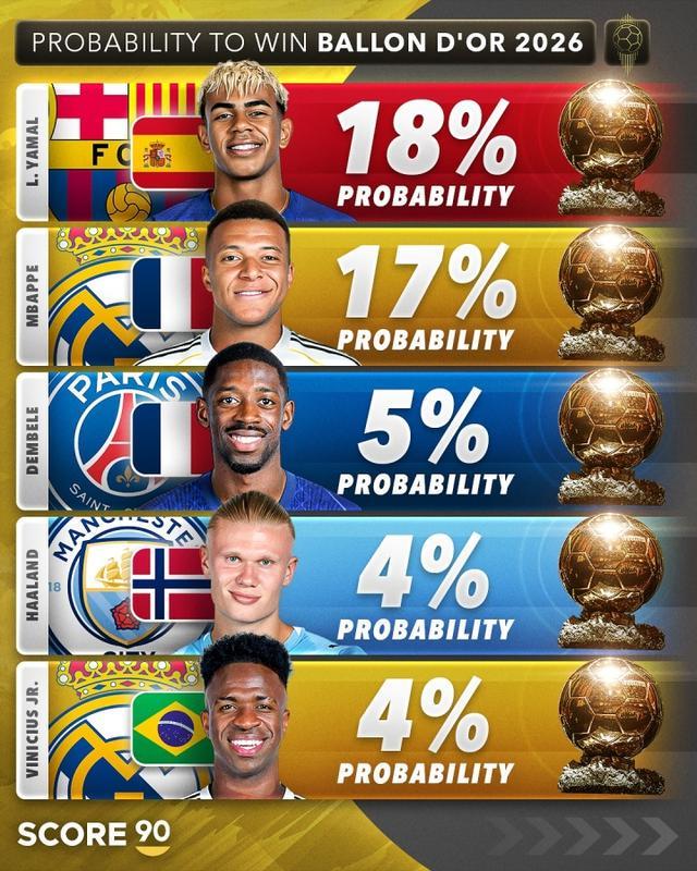 外媒列2026金球概率:亚马尔18%领跑,姆巴佩17%,登贝莱5%