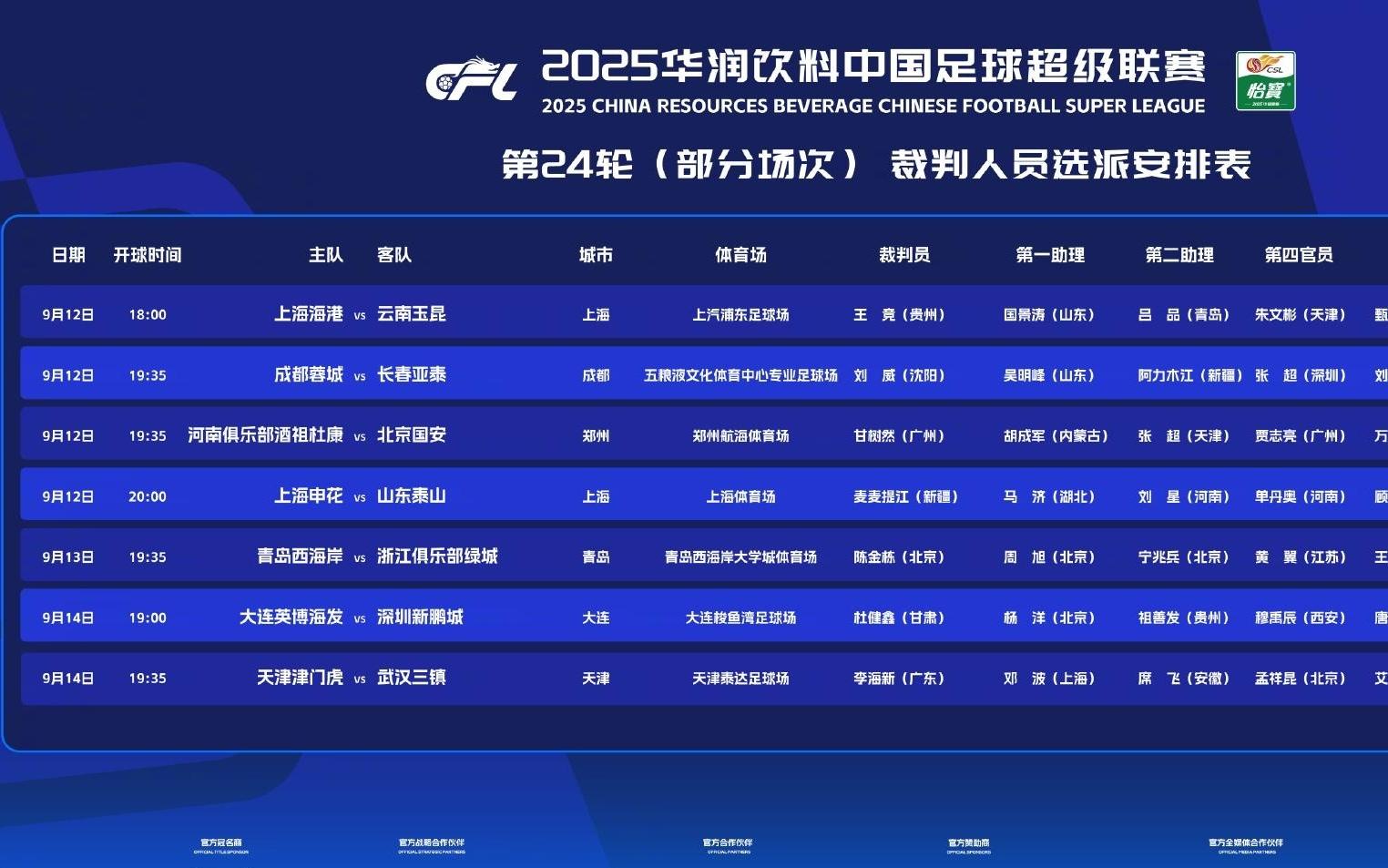 中超第24轮裁判安排:麦麦提江执法申花vs泰山