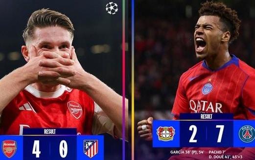 欧冠1夜9场轰43球!阿森纳13分钟40碾压马竞!大巴黎72狂胜药厂