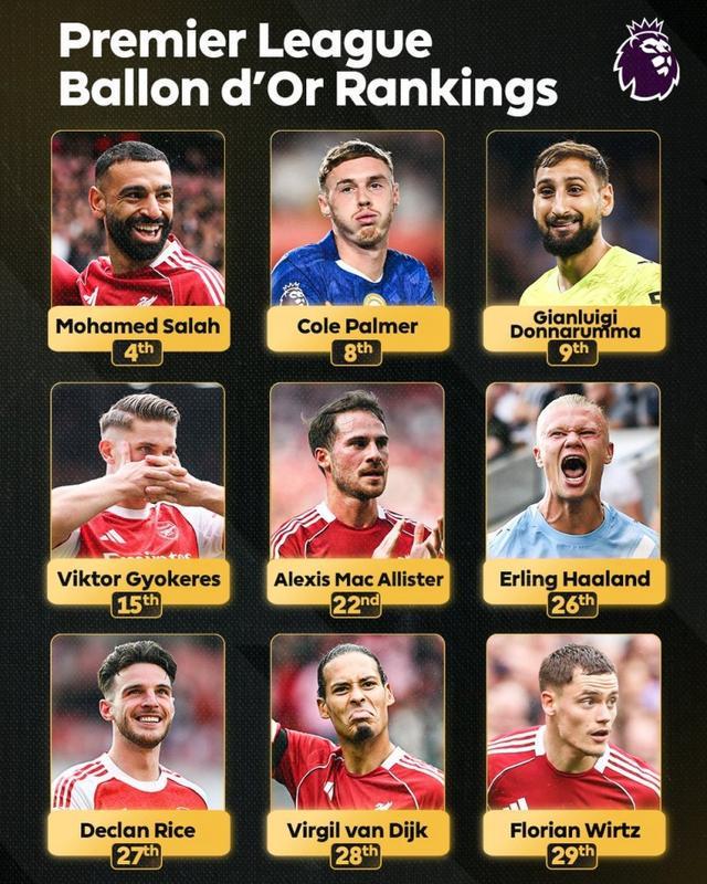 英超官方晒英超球员本届金球排名:萨拉赫第4最高,帕尔默第8