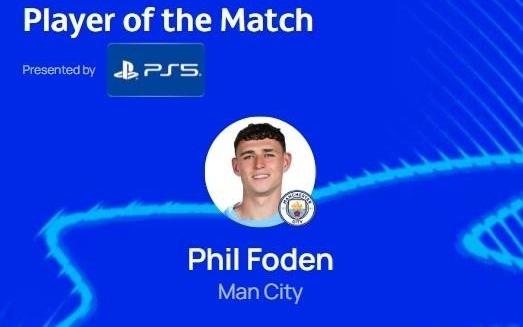 全场造8次机会+1次助攻,福登当选曼城vs那不勒斯最佳球员