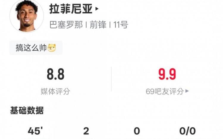拉菲尼亚本场比赛数据:2射正2进球1过人成功,评分8.8