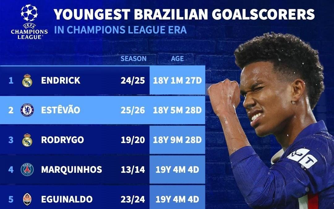 仅次于恩德里克,埃斯特旺是欧冠进球第二年轻的巴西球员
