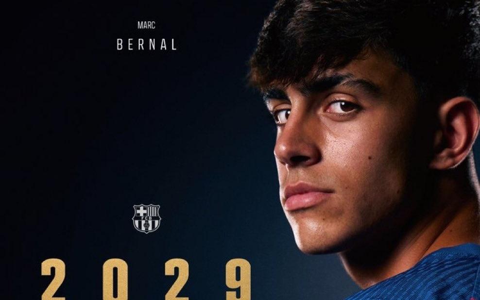 官方:巴萨与18岁中场小将伯纳尔续约至2029年