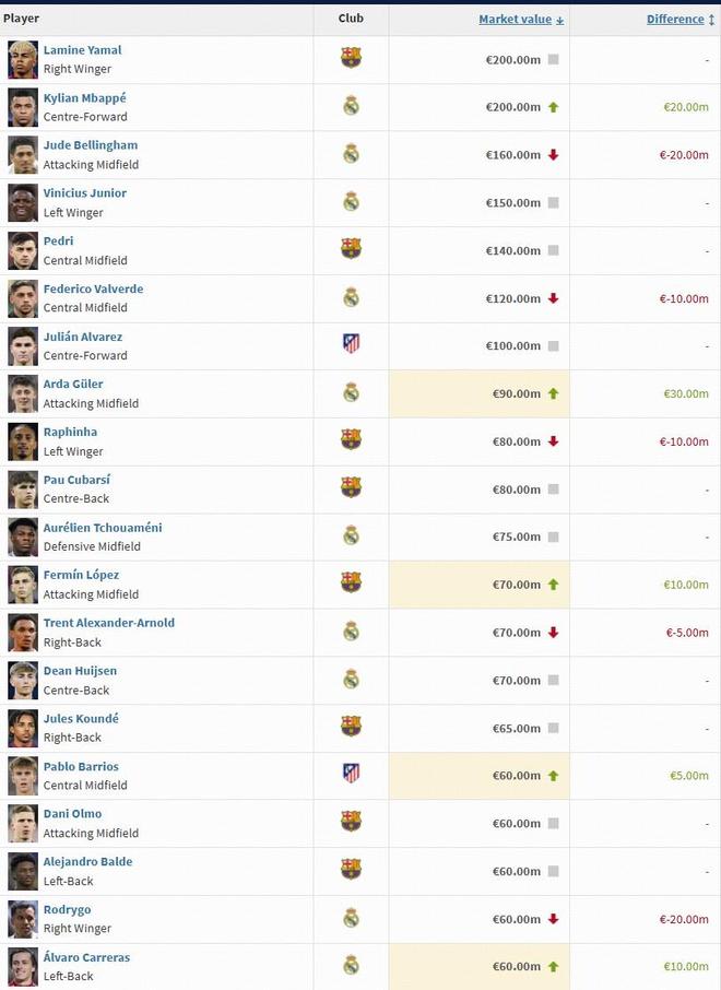 西甲球员身价变更:亚马尔、姆巴佩2亿欧并列第一,7人身价上亿