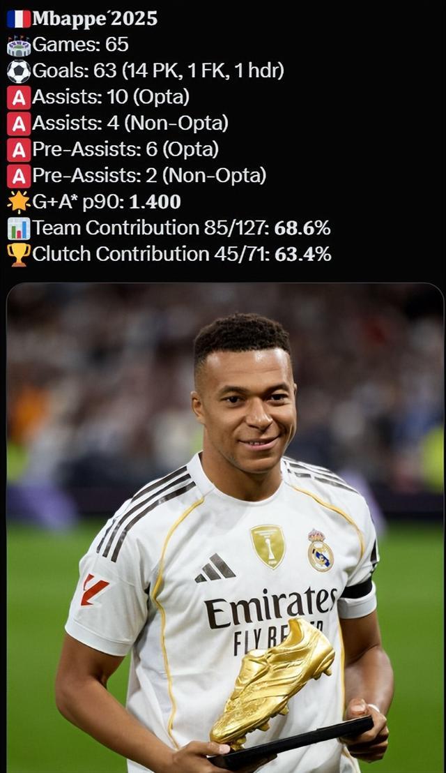 今天凌晨,姆巴佩在西甲对阵阿拉维斯的比赛中打进一球,这来他2025年就打进了63球了,63球在德转的自然年的进球排名中,能够排在第6的位置,和2012年的C罗并列。前五分别是梅西的91球、盖德-穆勒的85球、C罗和莱万的69球、以及方丹的66球。