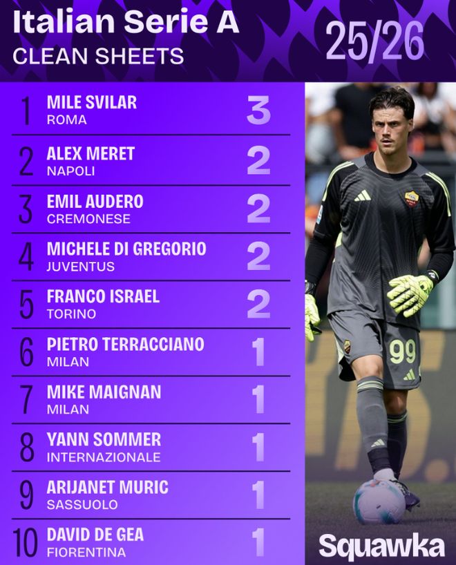 值得一提的是,斯维拉尔2025年24场意甲联赛保持14场零封,这项数据也是意甲第一。